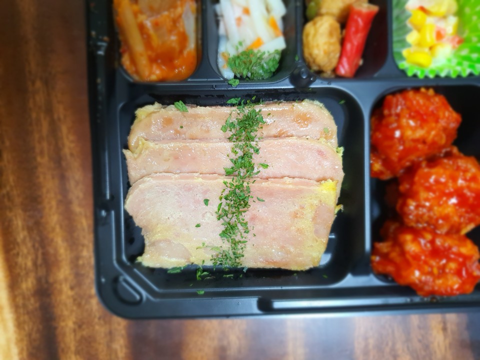 첫째로는 스팸입니다. 스팸을 잘 보면 계란물을 입힌 스팸을 볼 수 있어요.