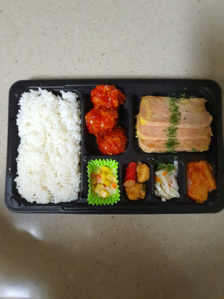 도시락의 구성으로는 밥, 닭강정, 스팸, 감자볶음, 볶음김치, 어묵볶음, 콘샐러드로 이루어져 있어요.