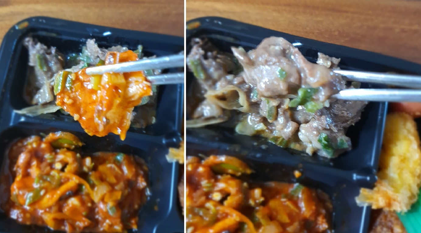 GS25가 양에 치중한 탓일까요? 맛은 양과 달리 많이 달랐습니다. 우선 밑반찬의 경우는 제가 개인적으로 오이를 싫어하고 못 먹어서 아쉬웠으며, 볶음 깍두기의 경우 너무 물렁물렁하여, 식감이 이상하였으며, 모둠튀김의 경우 밥과 같이 먹기가 껄끄러울 정도로 느끼했습니다. 그리고 메인 메뉴인 오징어 제육볶음과 소불고기에서 시큼한 맛이 너무 강해, 다른 반찬들의 맛이 잘 느껴지지 않았습니다.